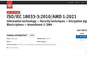 2021年6月25日,我國SM4分組密碼算法作為國際標準ISO IEC 18033-3:2010 AMD1:2021《信息技術 安全技術 加密算法 第3部分:分組密碼 補篇1:SM4》,由國際標準化組織ISO IEC正式發布。